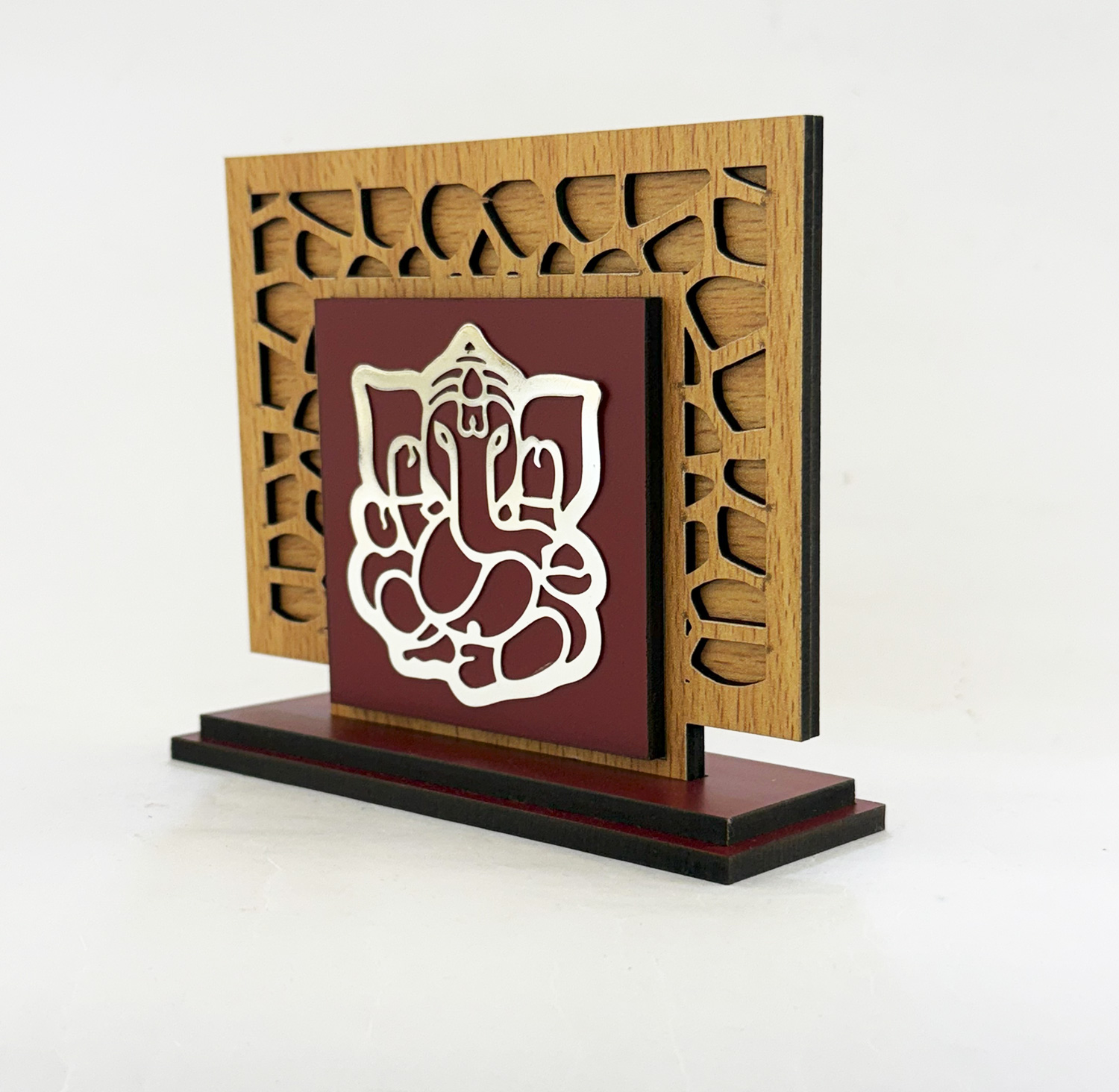 Artistic fine piercing work silver plated Ganesha with superfine details and set on a designer wood frame with pierced work.