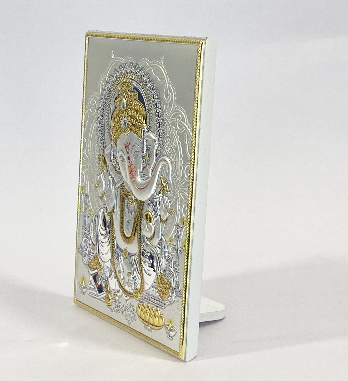 Gorgeous, rare art, ‘one of a kind’, fine 925 pure silver tabletop plaque of Lord Ganesha in matte finish with beautiful gold decorations and lacquered wood back (white).