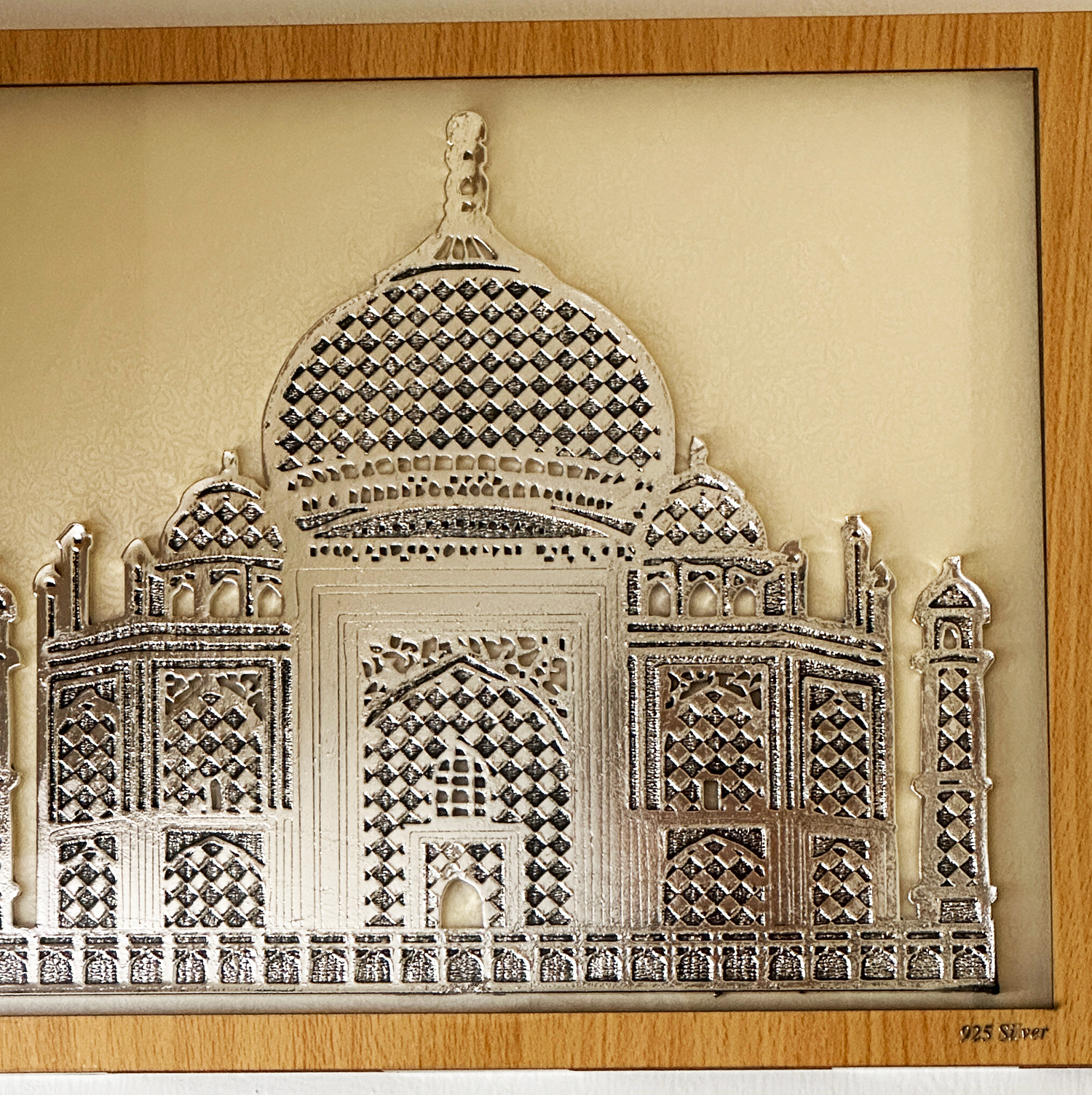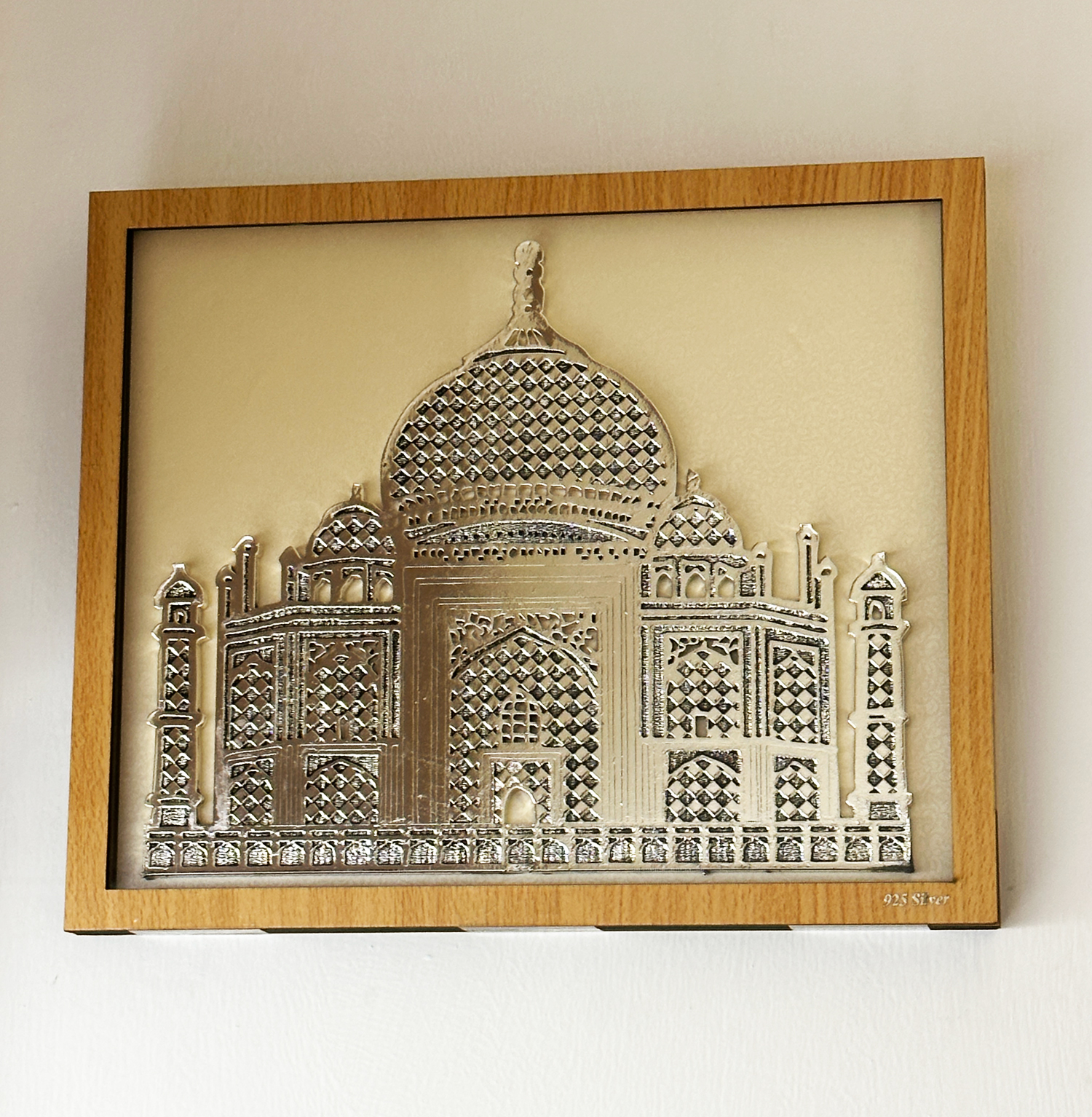 This Silver layered Plaque of Taj Mahal is in Anti-tarnish cote and have a very enduring and lasting finish. it is set in a square wood frame and looks very good on a wall.