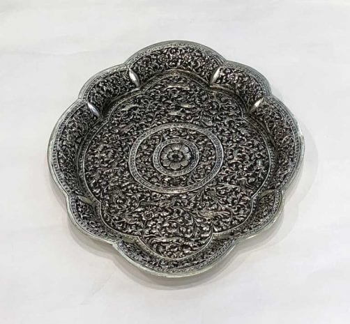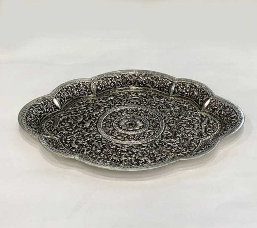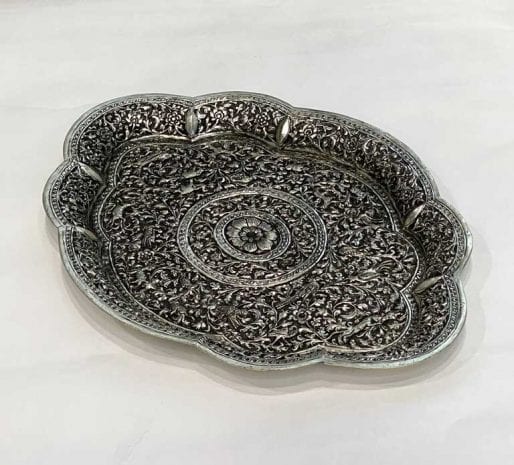 This Antique Silver Plated Oval Tray is handcrafted in a copper sheet, heavily silver plated and then given an antique finish. Finally it is given an Anti – Tarnish cote for lasting and enduring use.