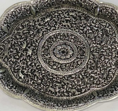 Superfine, handcrafted and fully carved Antique Silver Plated Oval Tray. 14″ Size.