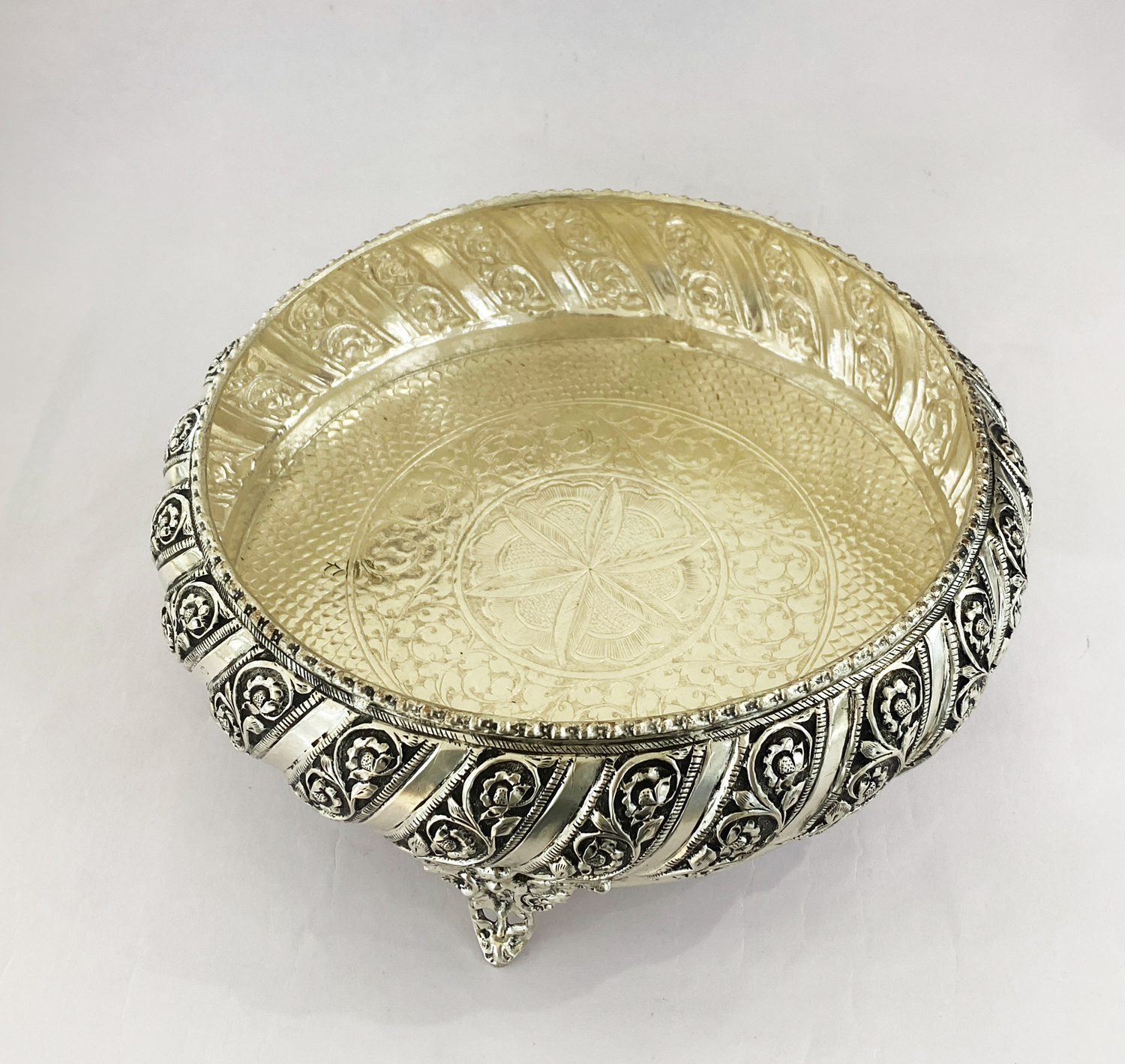 This antique Silver Plated centerpiece or urli depicts an all over ornate pattern. Deep repousse work.
