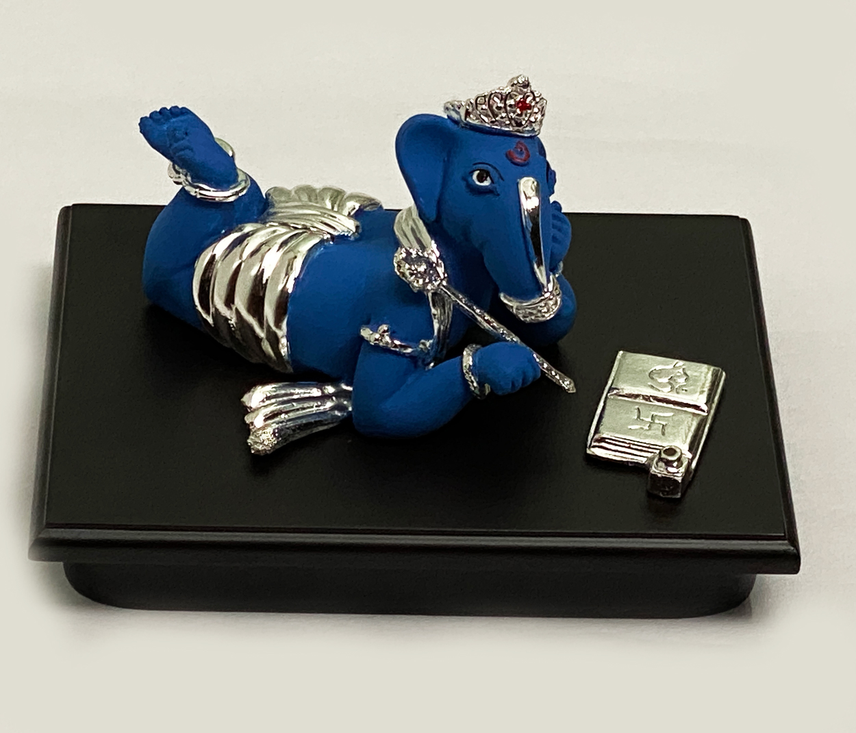 This reclining blue silver Ganesh doing accounts is made of Resin Silver in Anti-tarnish finish.