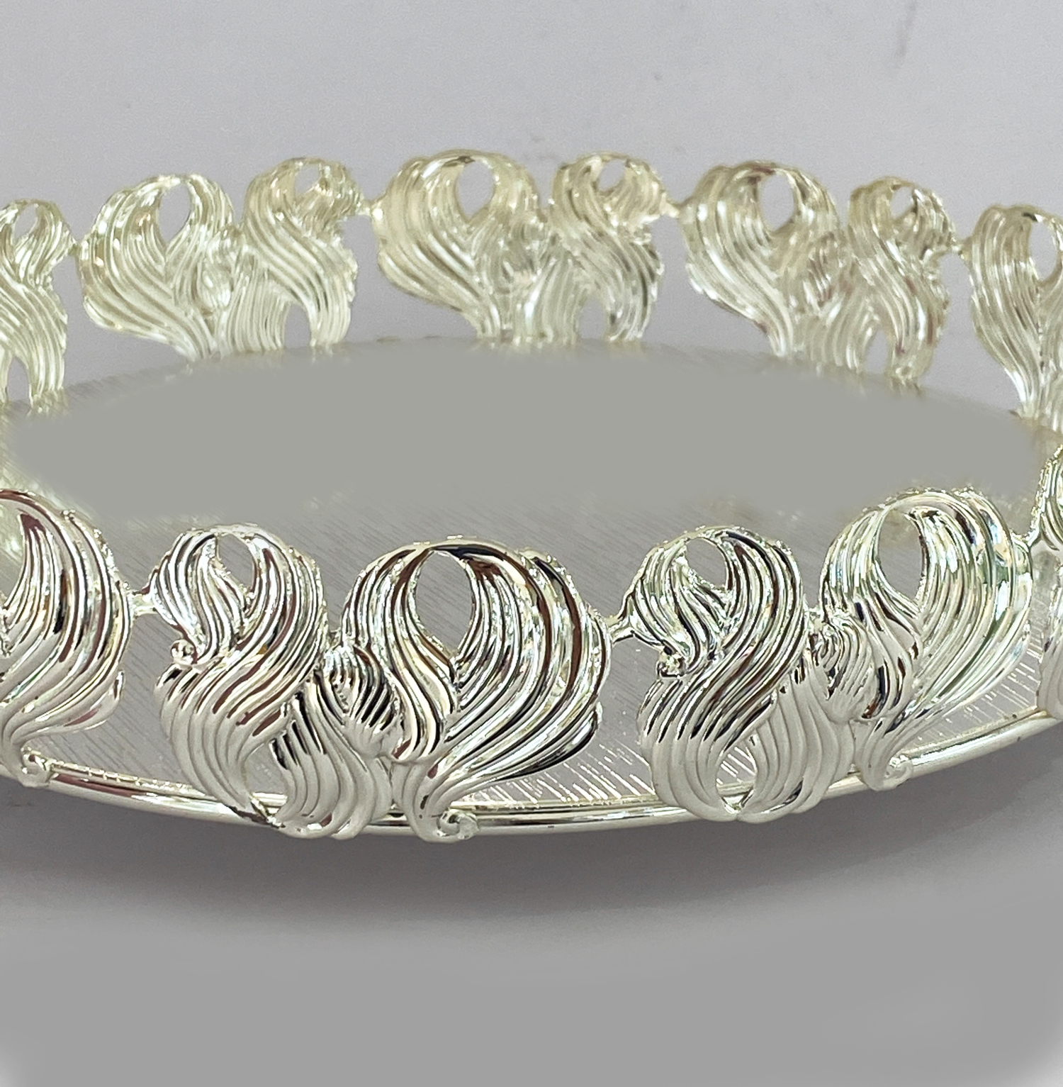 Gorgeous round silver plated centerpiece with embossed side border in high polish finish.. Size: 8.2″ dia.