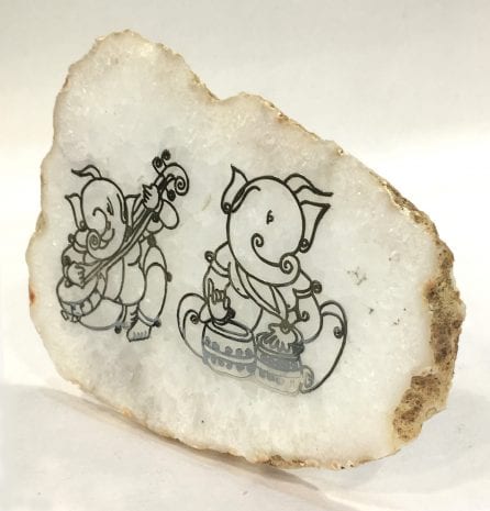 Gorgeous and Artistic CUTOUT in Silver Foil of a Pair of Mini Musical Silver Ganesh and pasted on a fine Agate Stone plaque. Buy Musical Silver Ganesh Frame online.