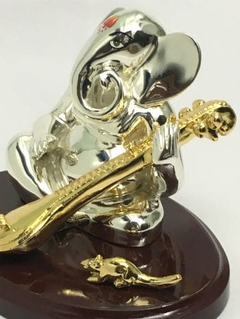 Gorgeous and Contemporary Sitting Silver Ganesha Playing a Gold Plated Sitar with a Gold plated Modak and set on a Lacquer Polished Wooden Base. Buy this Silver Sitar Ganesh Statue which is in High Polish finish.