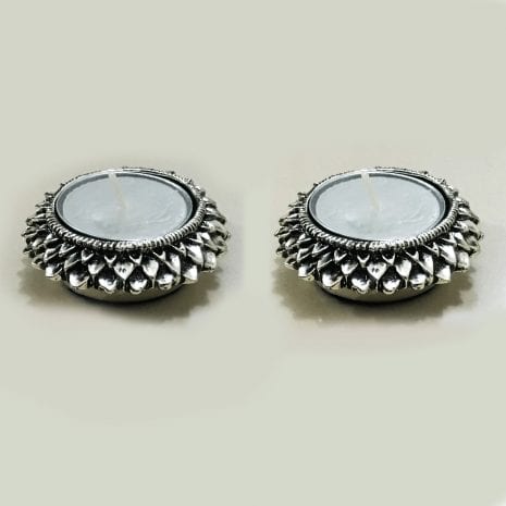 | Splendid and unique Mini Silver T-Lite Holder Pair in fine detailed Lotus flower border in antique and ethnic look.