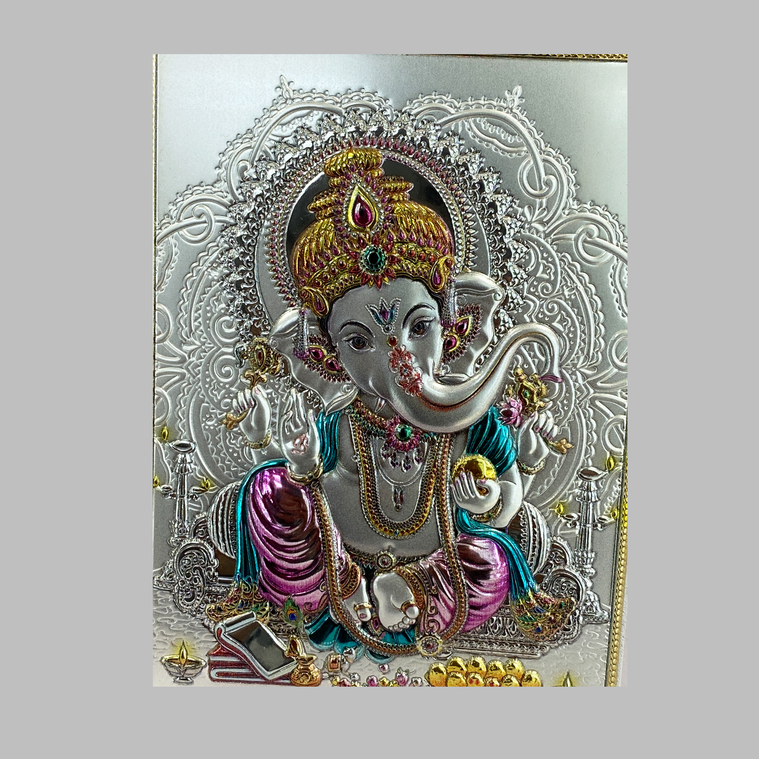 | Gorgeous, rare art, ‘one of a kind’, fine 925 pure silver tabletop plaque of Lord Ganesha in matte finish with beautiful enamel and gold decorations. Size: 5X7 Inch