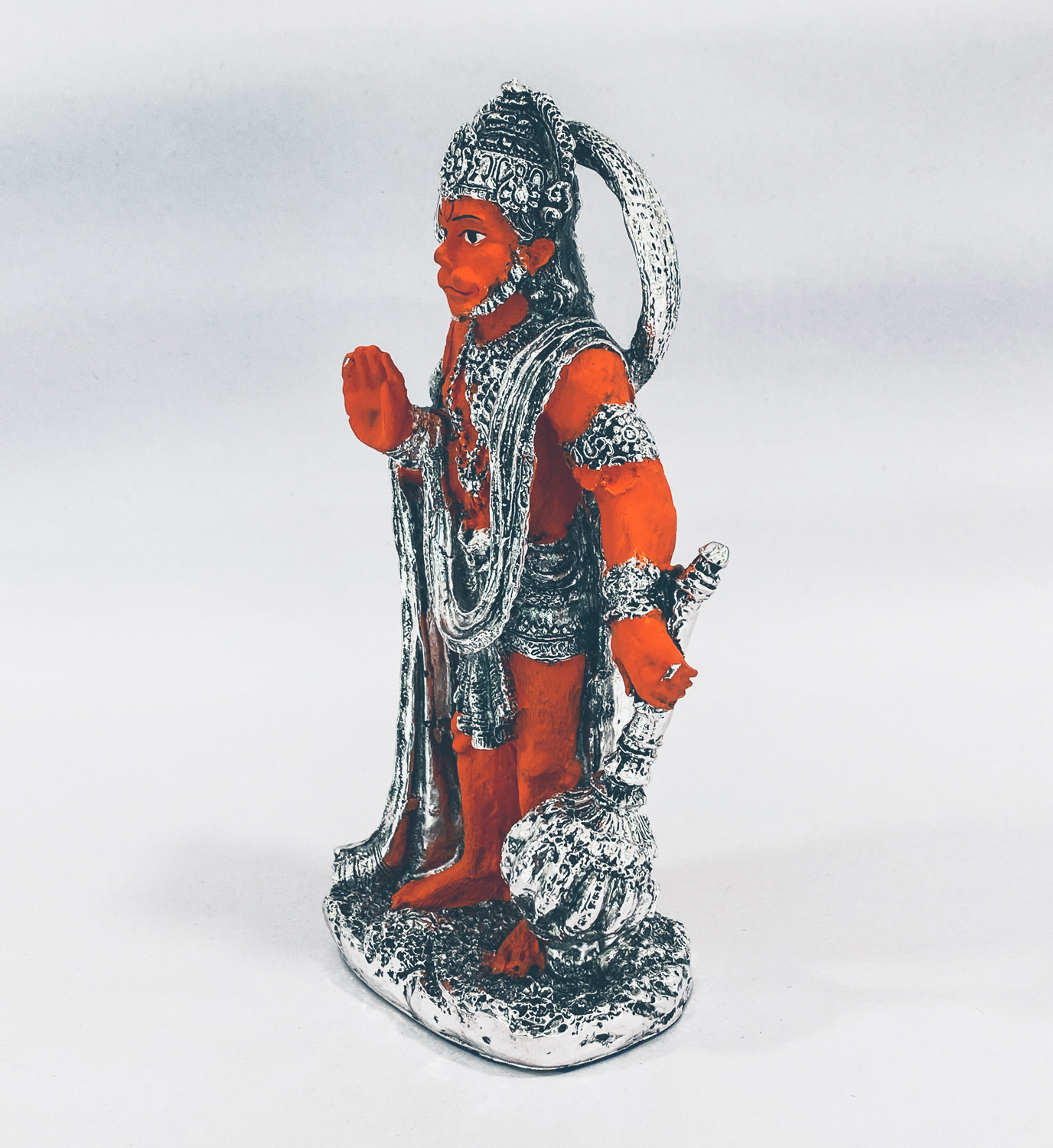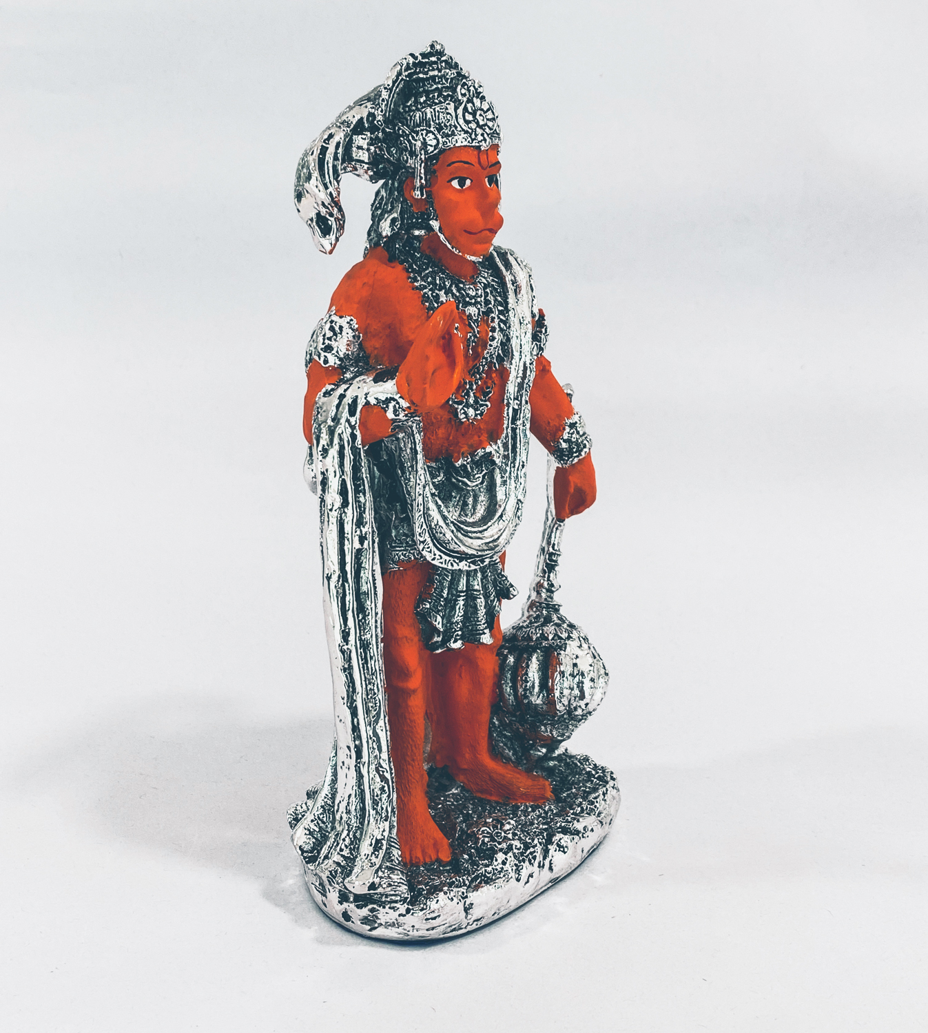 RESIN SILVER – This term is used for items which are layered outside with silver sheet and filled inside with Non Metallic Organic substance. Buy this Silver Hanuman Statue in standing pose in Geru colour which is in Anti-Tarnish Cote and have a very enduring and lasting finish.