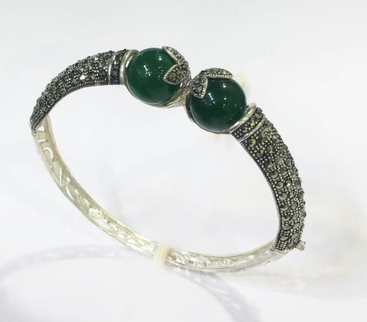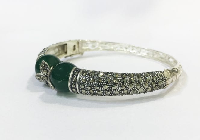 Gorgeous, fine real marcasite and two green onyx balls – adjustable bracelet in 925 sterling silver. 15 mm wide. .This bracelet is antique finished. Comes packed in a nice fancy box.