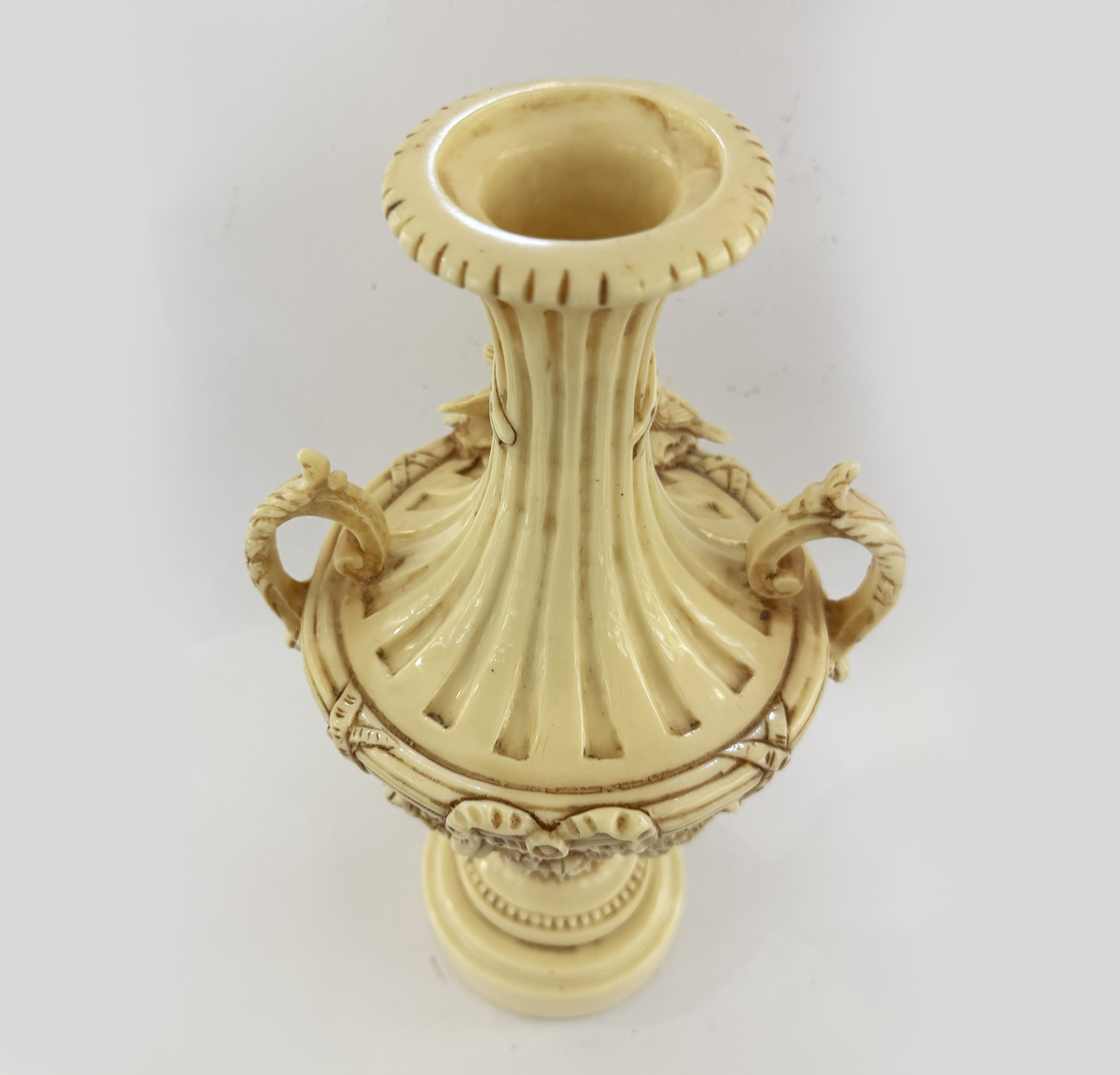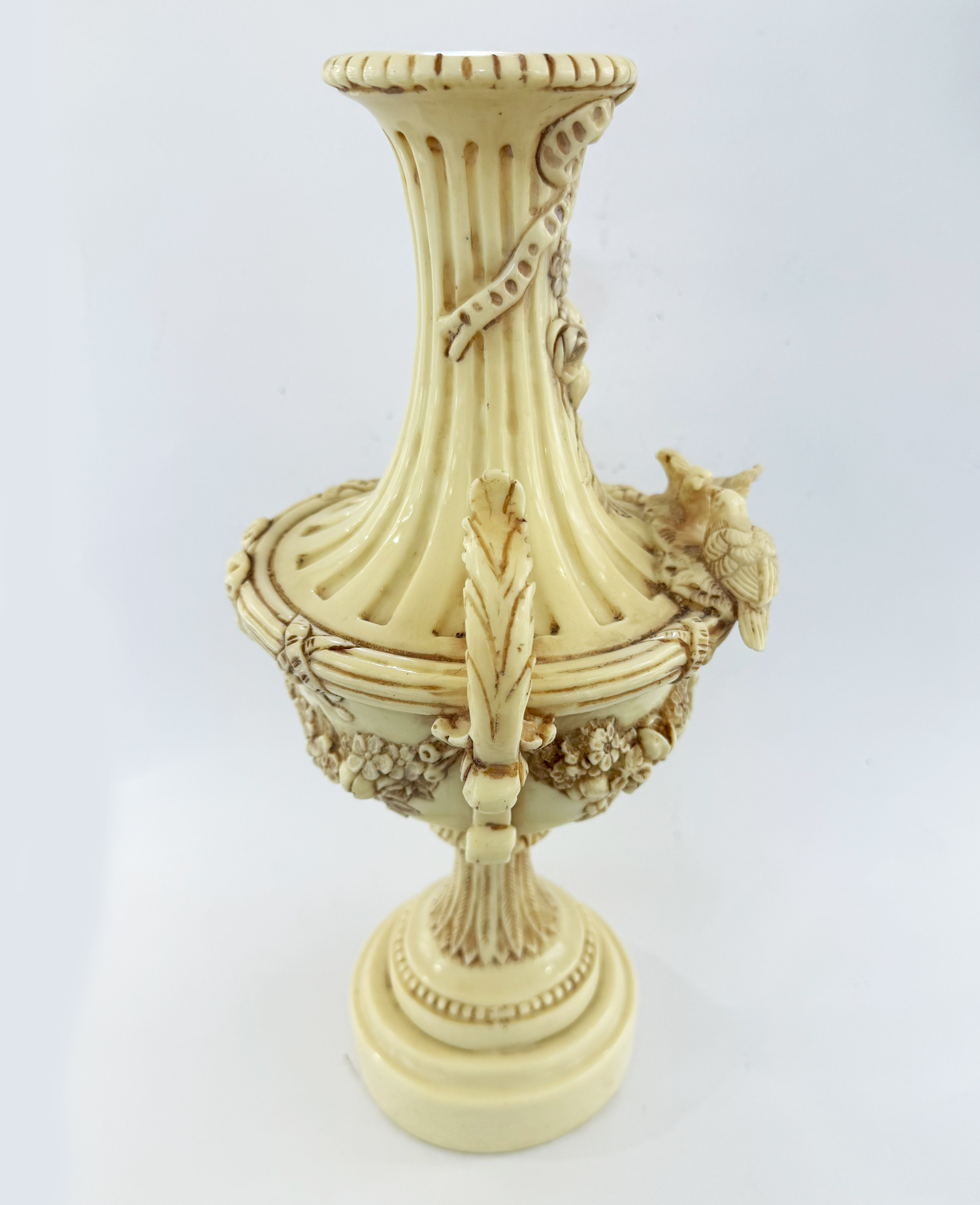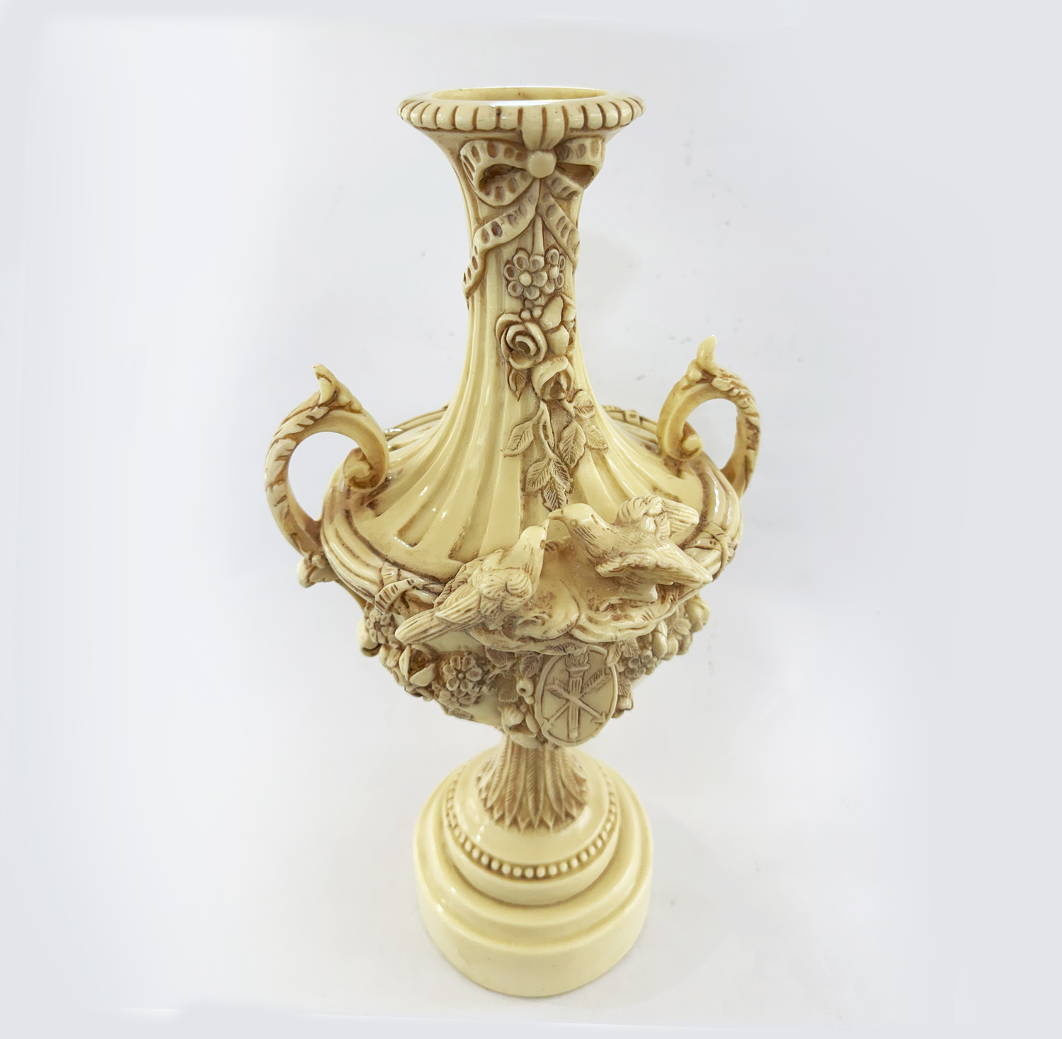 This unique Vase Decor piece with floral and bird carving in Ivory Look, is a luxurious artifact and is made with white lustrous material or French Ivory. This flawless sophisticate creation looks just like real Ivory.