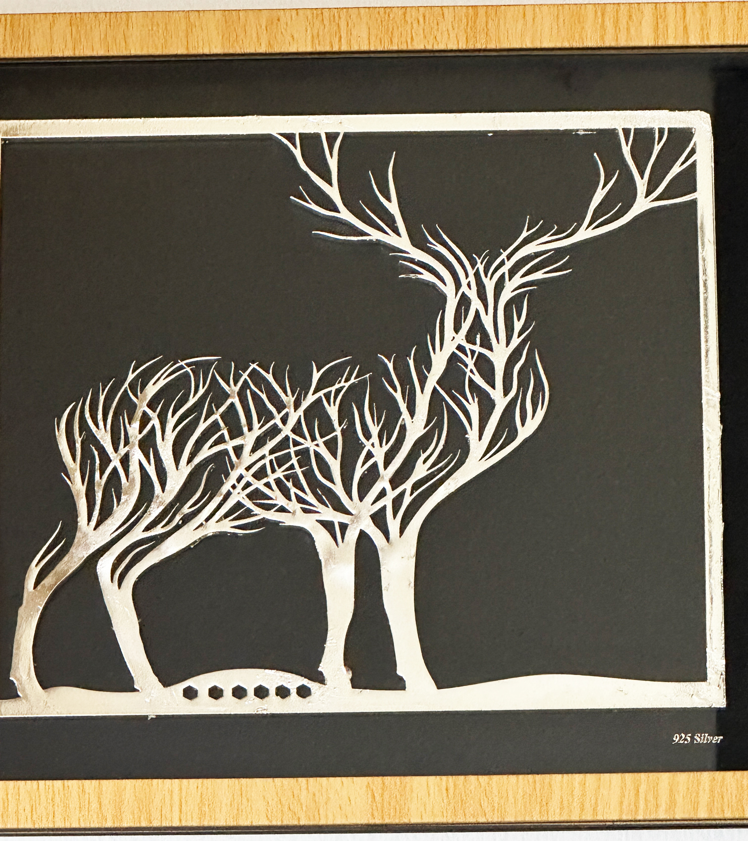 This cutout of a Deer featuring Tree of Life design and is heavily silver layered and given an anti-tarnish cote for enduring and lasting use. It it is set in a square wood frame and looks very good on a wall.