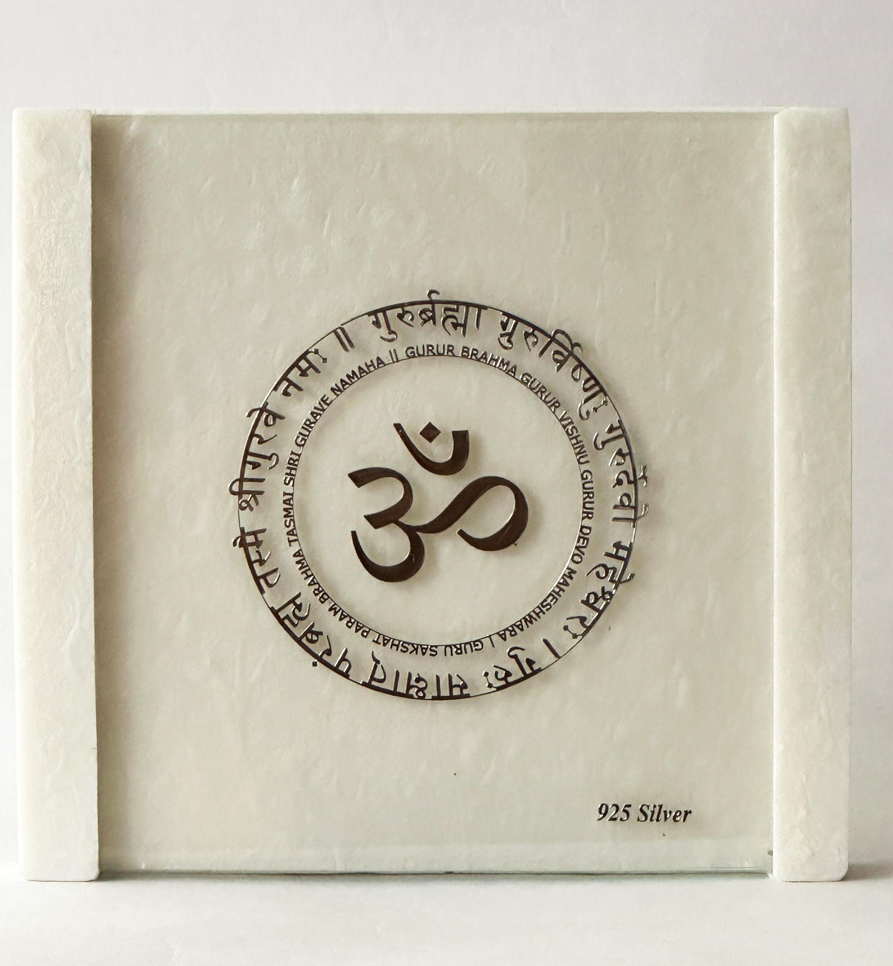 Buy this silver foil Mantra frame of Gurur Brahma, Gurur Vishnu, Gurur Devo Maheshwara which can be customized with your inscriptions or logo. Customization charges are extra. We require 5-7 days EXTRA time for doing it. Please Contact Us for any of your requirements. Minimum suggested quantity for customization is 3 or more pieces.