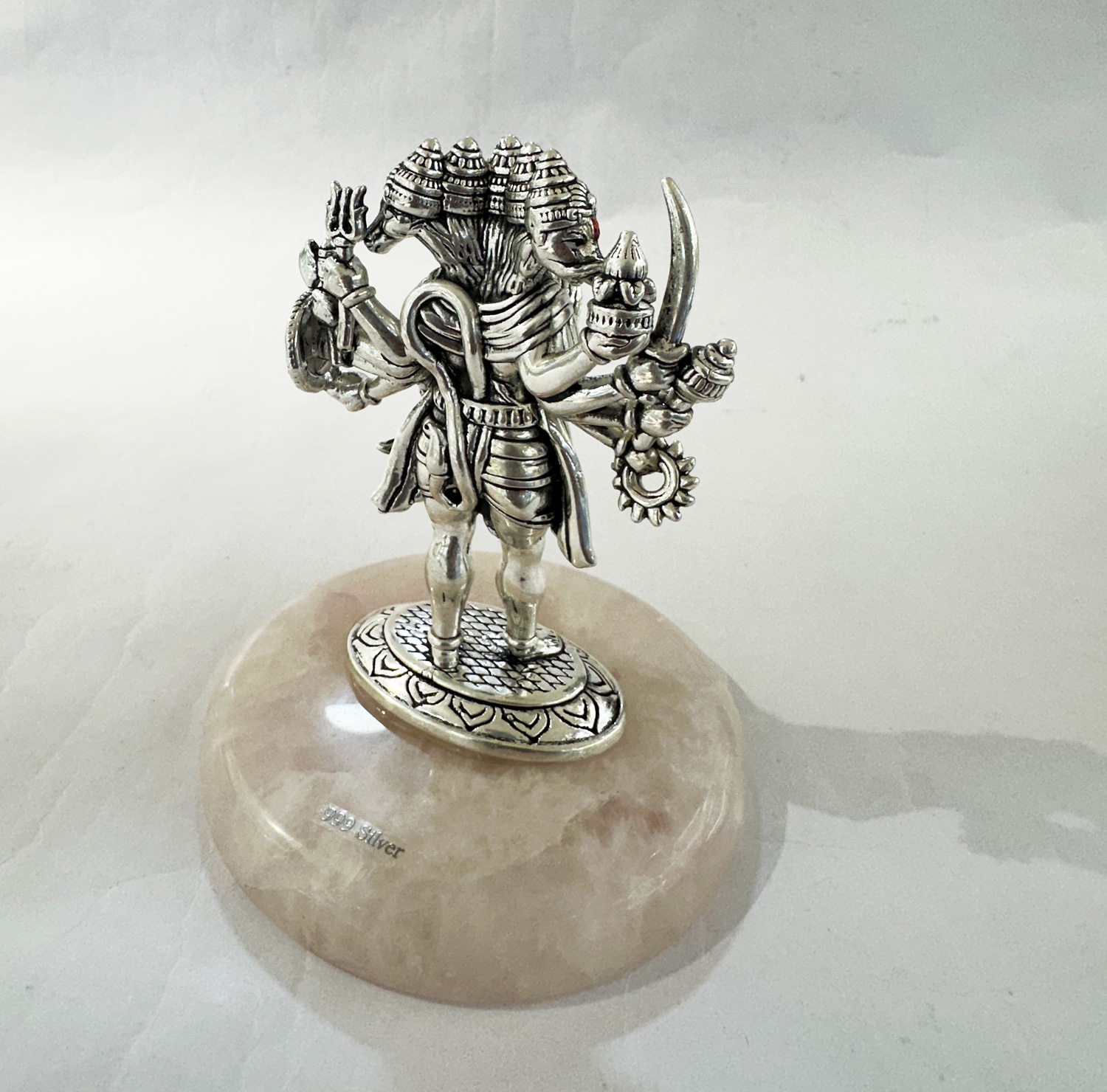 Pure 999 silver Punchmukhi Hanuman Statue in a standing pose. Superfine handmade in antique finish in 99.9 percent pure silver and set on a natural rose quartz stone base. Size – 4.5″ height
