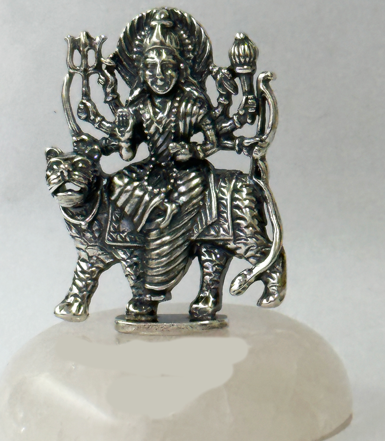 Be the first to review “Pure Silver Durga Mata Statue on Rose Quartz Base | 2.5″ Ht”