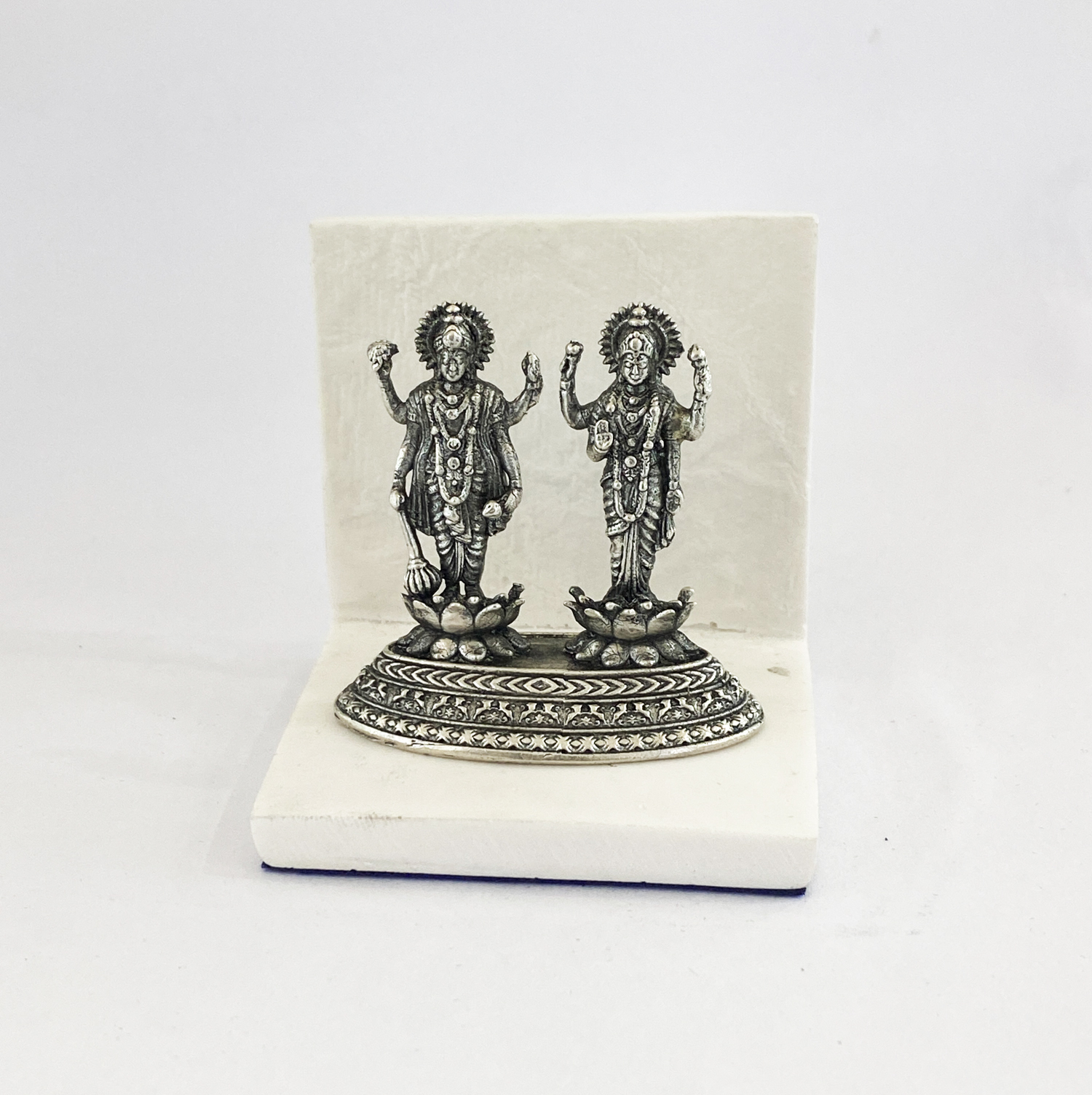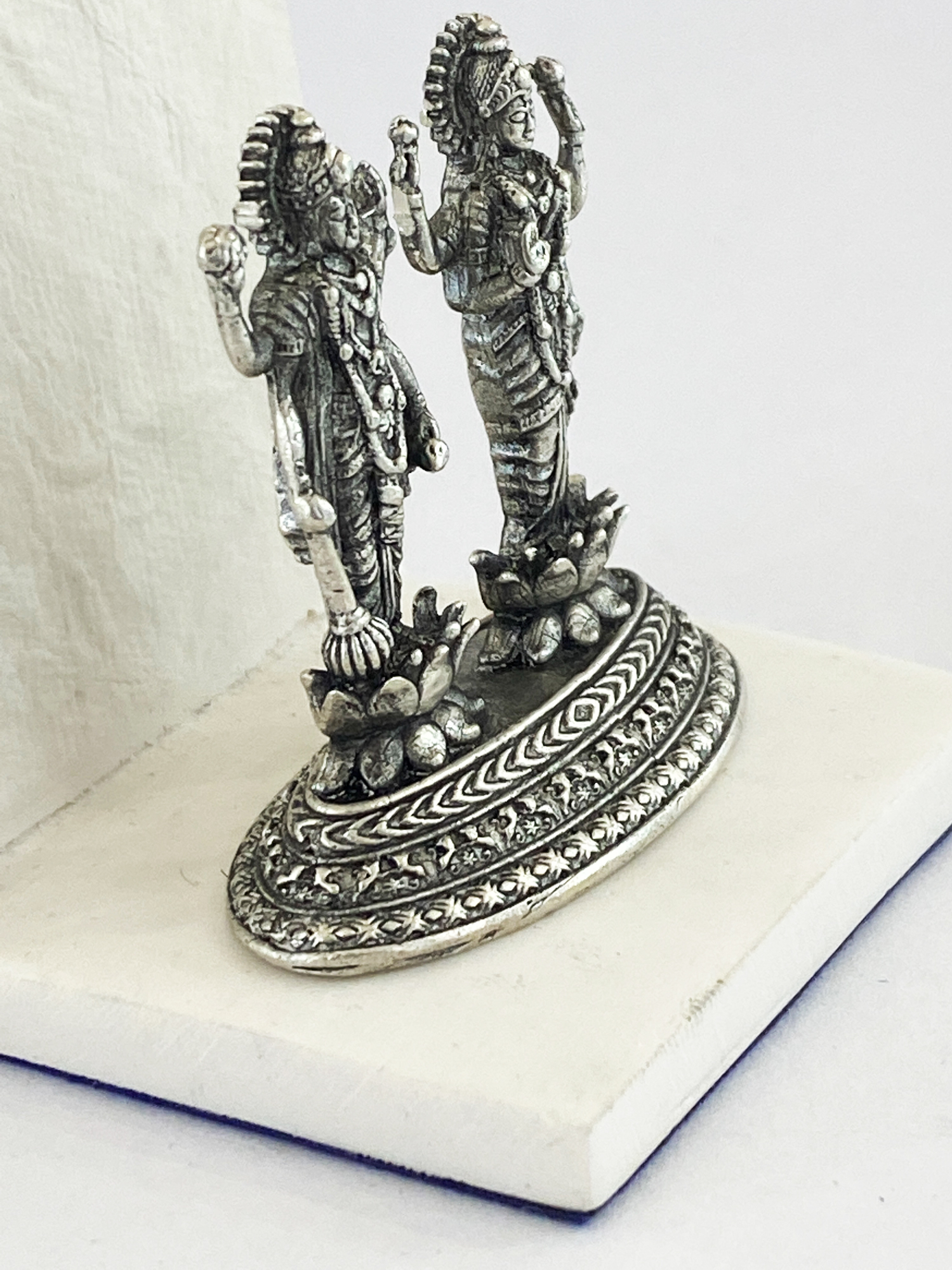 Marvellous and artistic reproduction of a pure silver Vishnu Laxmi idol in 92.5% Pure Silver in superfine and antique finish in a standing pose in 2d and set on a marble look base. Size: 55 mm height with base and 23 gms weight.
