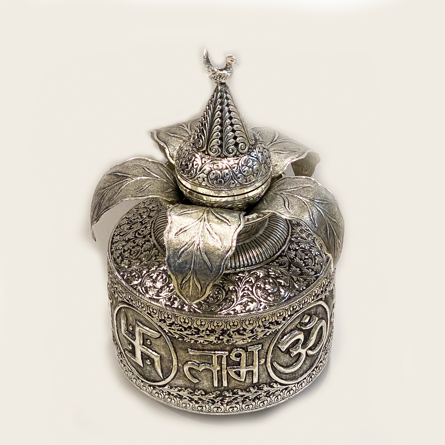 Artistic, royal, super repousse work silver plated kalash with Satia and Om embssed and with leaf and Nariyal. Size: 9″ Diameter