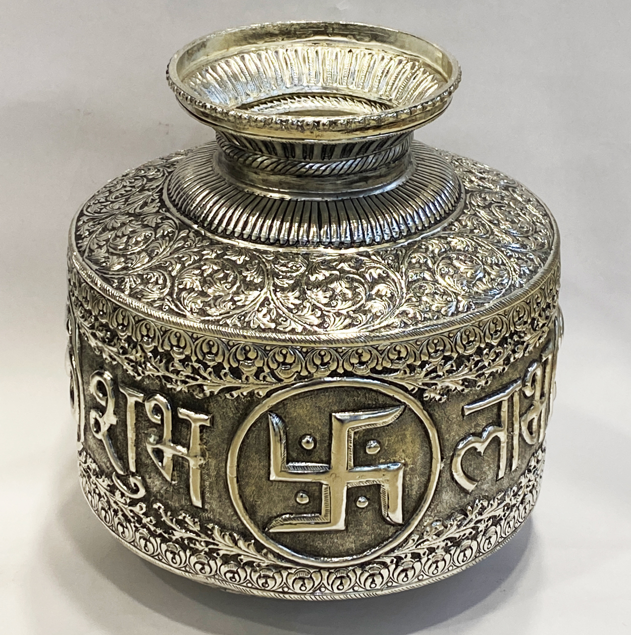 Gorgeous, royal, super repousse work silver plated kalash with Satia and Om embssed and with leaf and Nariyal placed on top.
