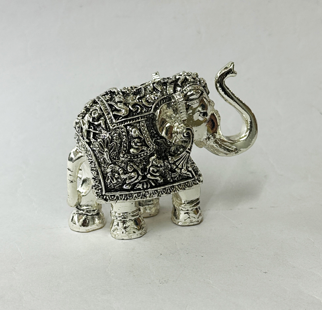 Rare Art, ‘One of a Kind’, an Ethnic & Antique finished reproduction of a Silver Elephant with trunk up featuring fine embossing work. 3″ Height.