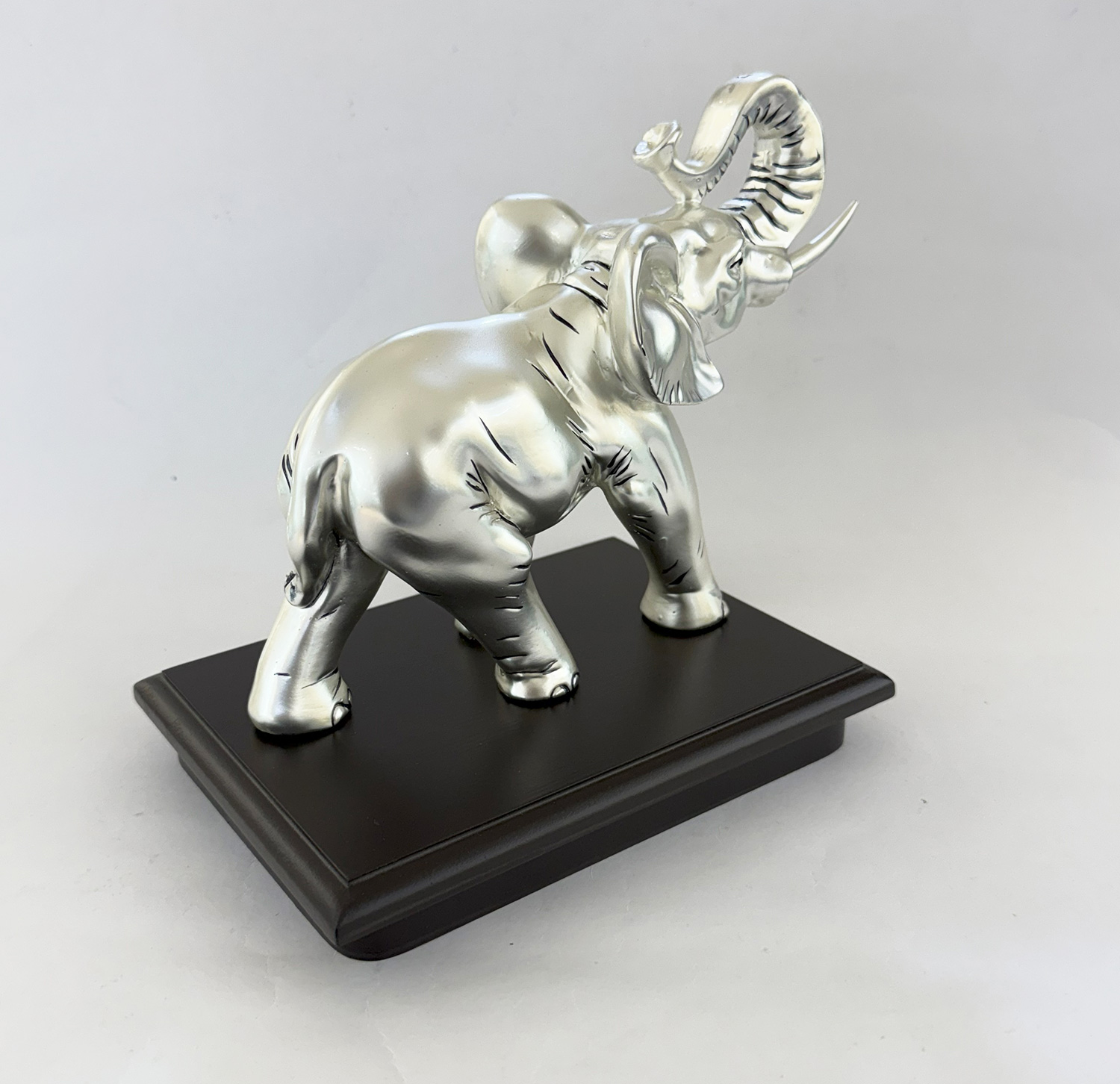 | Gorgeous, ‘One of a Kind’, matte finished reproduction of Classic Silver Elephant with Stem Upside and set on a lacquered wood base. Size – 8″ height with base.