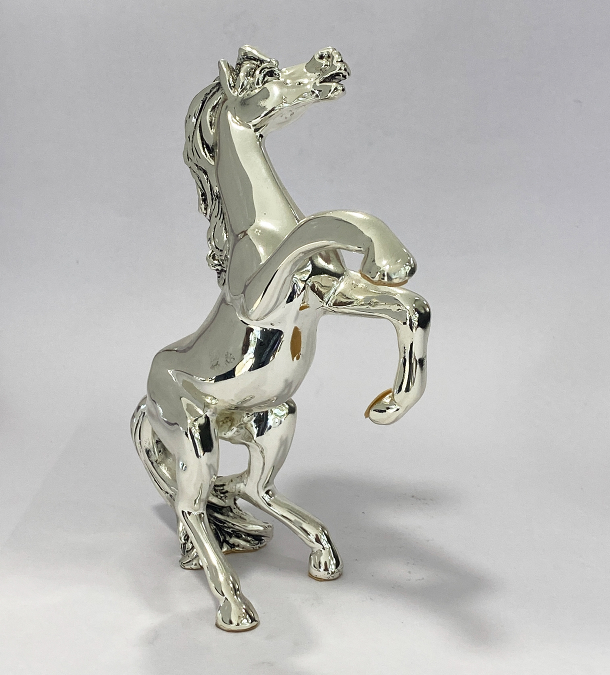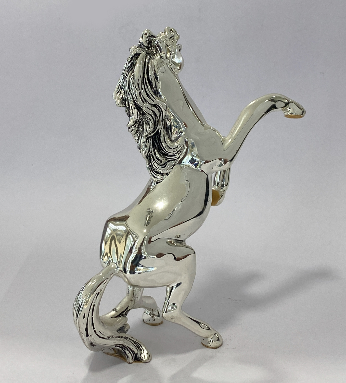 RESIN SILVER – This term is used for items which are layered outside with silver sheet and filled inside with Non Metallic Organic substance. Buy this sculpture of a silver horse standing on hind legs which is in Anti-tarnish cote and have a very enduring and lasting finish.