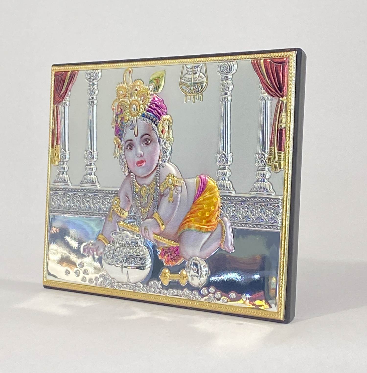 Silver Plaque Ladoo Gopal in Color | 5.2 Inch