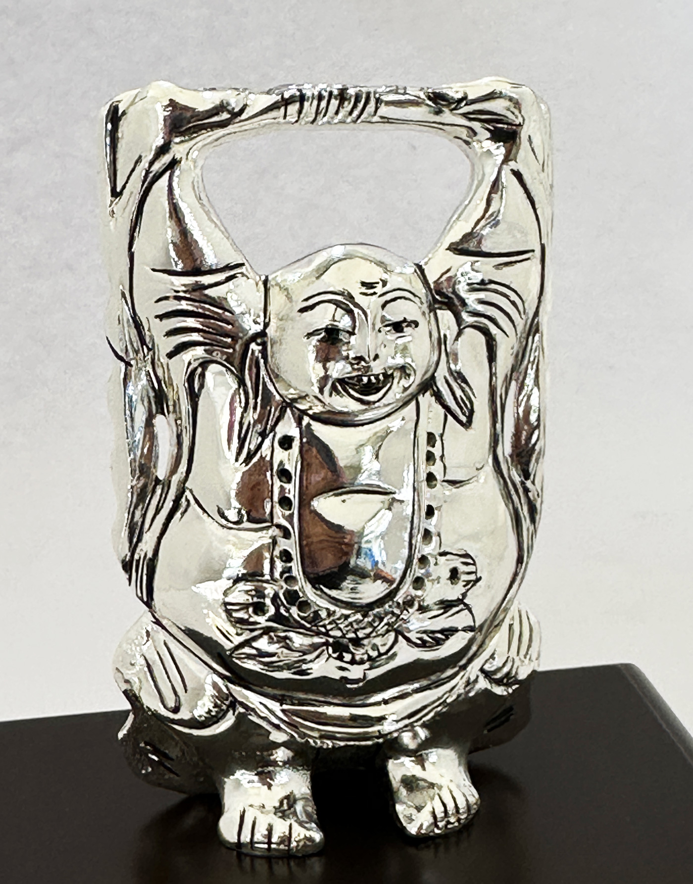 Silver Standing Laughing Buddha Wood Base | 6 Inch