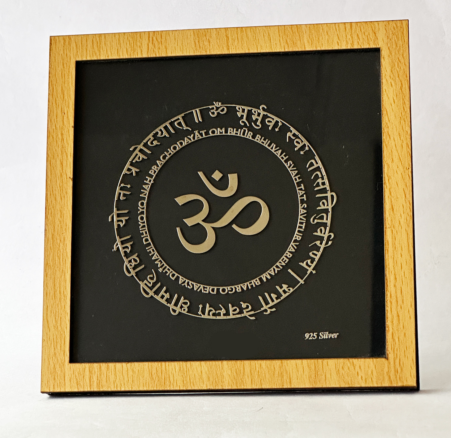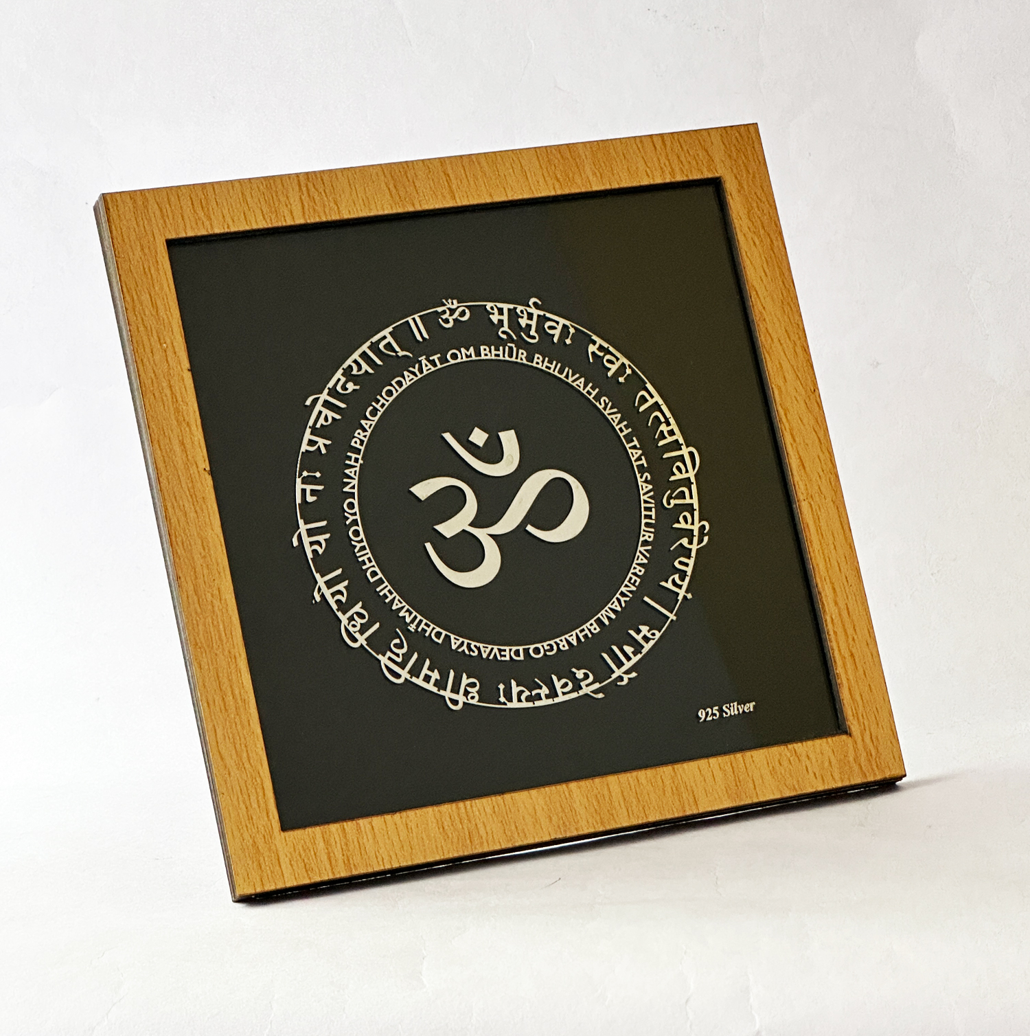 Superfine, gorgeous, cutout of a silver foil Gayatri Mantra with Om in round design set on a beautiful wood frame or tabletop . Size 6.5 x 6.5 inch.